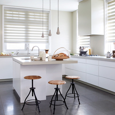 Zebra Roller shades allows contemporary design, seamlessly blending sheer and opaque fabric stripes for a harmonious play of light and privacy control.